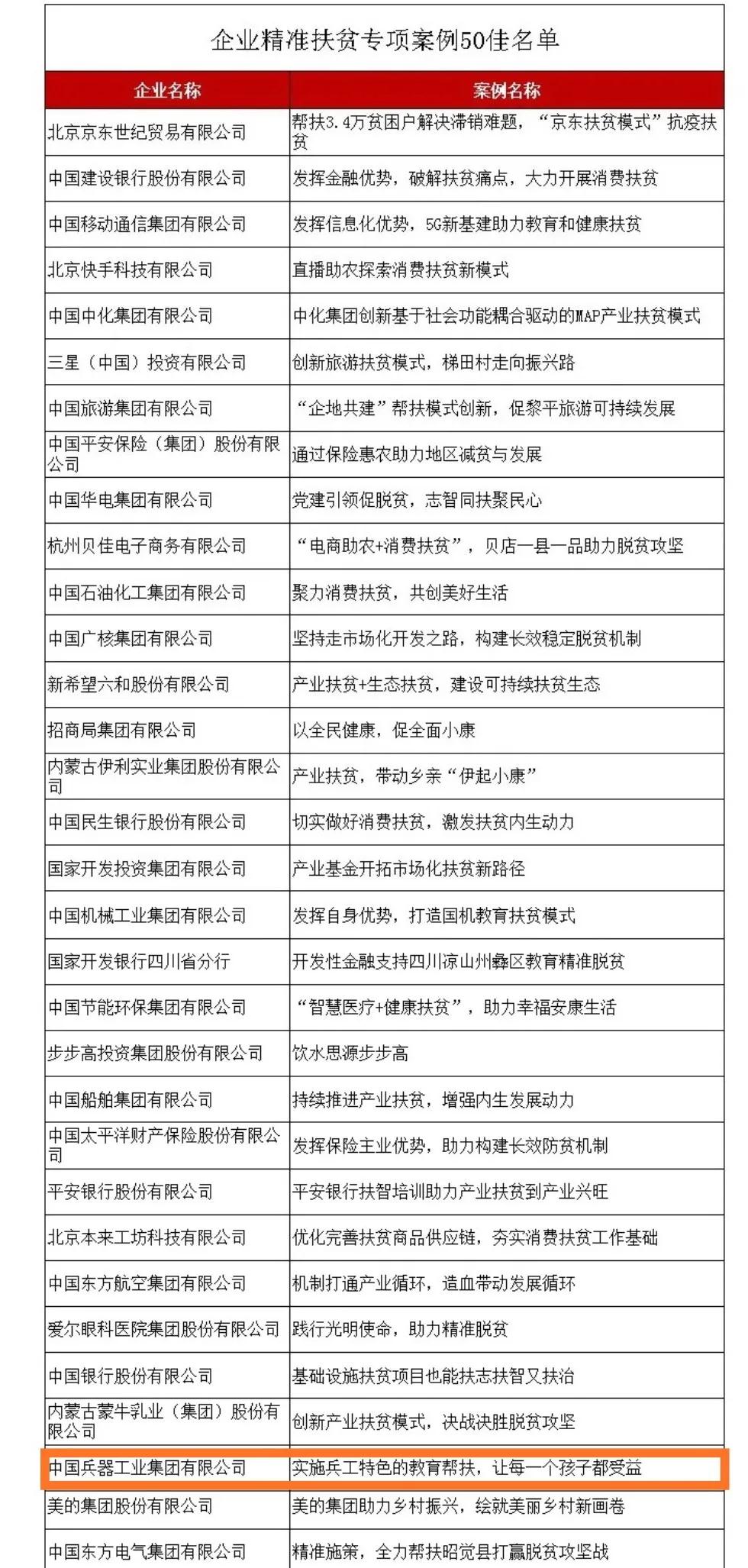 近日,國務(wù)院扶貧辦發(fā)布2020年企業(yè)精準(zhǔn)扶貧案例獲獎(jiǎng)名單,中國兵器工業(yè)集團(tuán)有限公司《實(shí)施兵工特色的教育幫扶,讓每一個(gè)孩子都受益》案例入選2020年企業(yè)精準(zhǔn)扶貧專項(xiàng)案例“50佳”。
