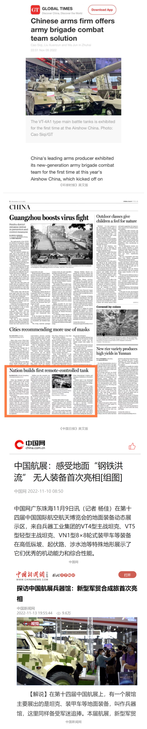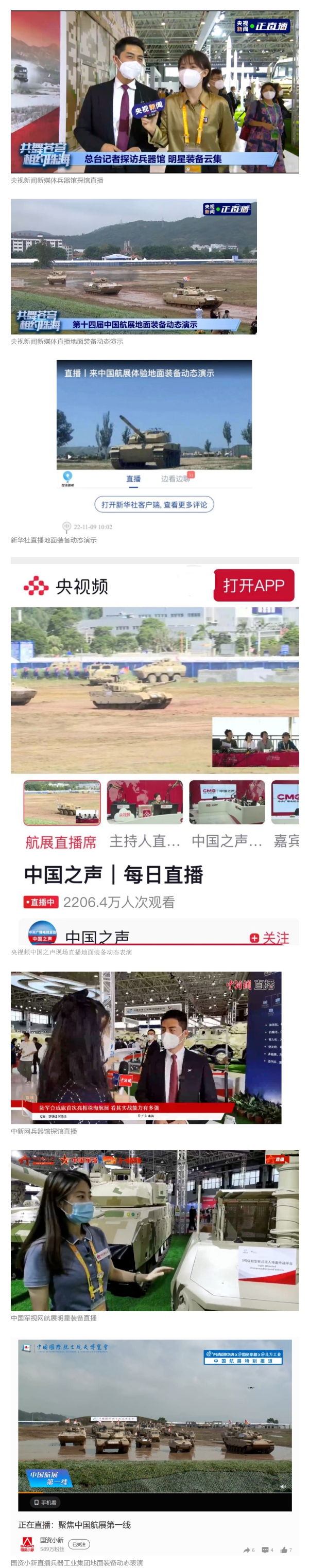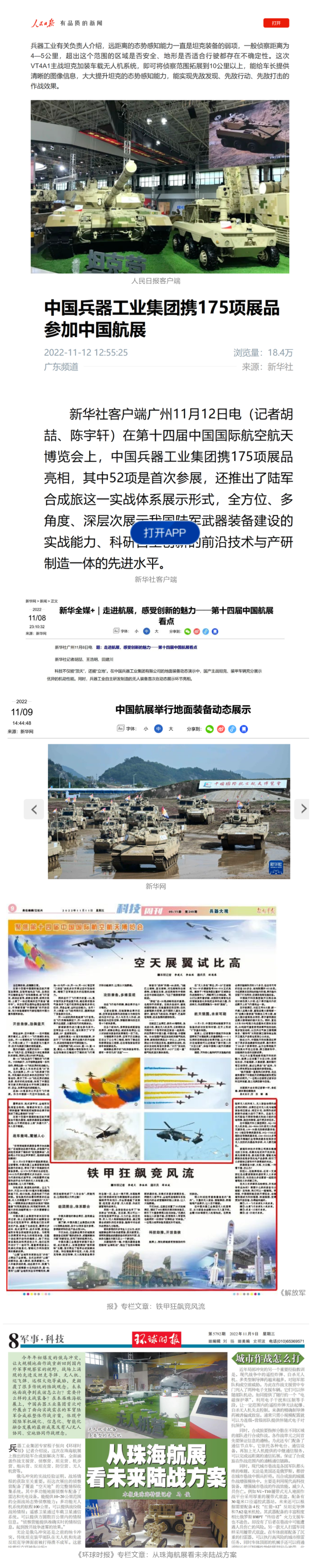 央視國防軍事頻道航展特別報(bào)道《炫舞天地間》11月12日《賞“鐵甲雄風(fēng)”!看航展地面裝備“鋼鐵洪流”名場面》對兵器工業(yè)集團(tuán)武器裝備特色亮點(diǎn)進(jìn)行報(bào)道?!秶儡娛略鐖?bào)》11月7日推出報(bào)道《第十四屆中國國際航空航天博覽會明天開幕 中國兵器館首次以陸軍合成旅實(shí)戰(zhàn)體系形式展出》,對兵器館陸軍合成旅實(shí)戰(zhàn)體系進(jìn)行報(bào)道?!盾娛聢?bào)道》11月9日推出《第十四屆中國國際航空航天博覽會 地面兵器裝備首次聯(lián)合陸航直升機(jī)進(jìn)行動(dòng)態(tài)展示》報(bào)道?!盾娒孕刑煜隆?1月9日推出報(bào)道《軍迷打卡航展2022》以專業(yè)軍迷視角探館兵器館,全面展示兵器工業(yè)集團(tuán)參展裝備特色亮點(diǎn)。