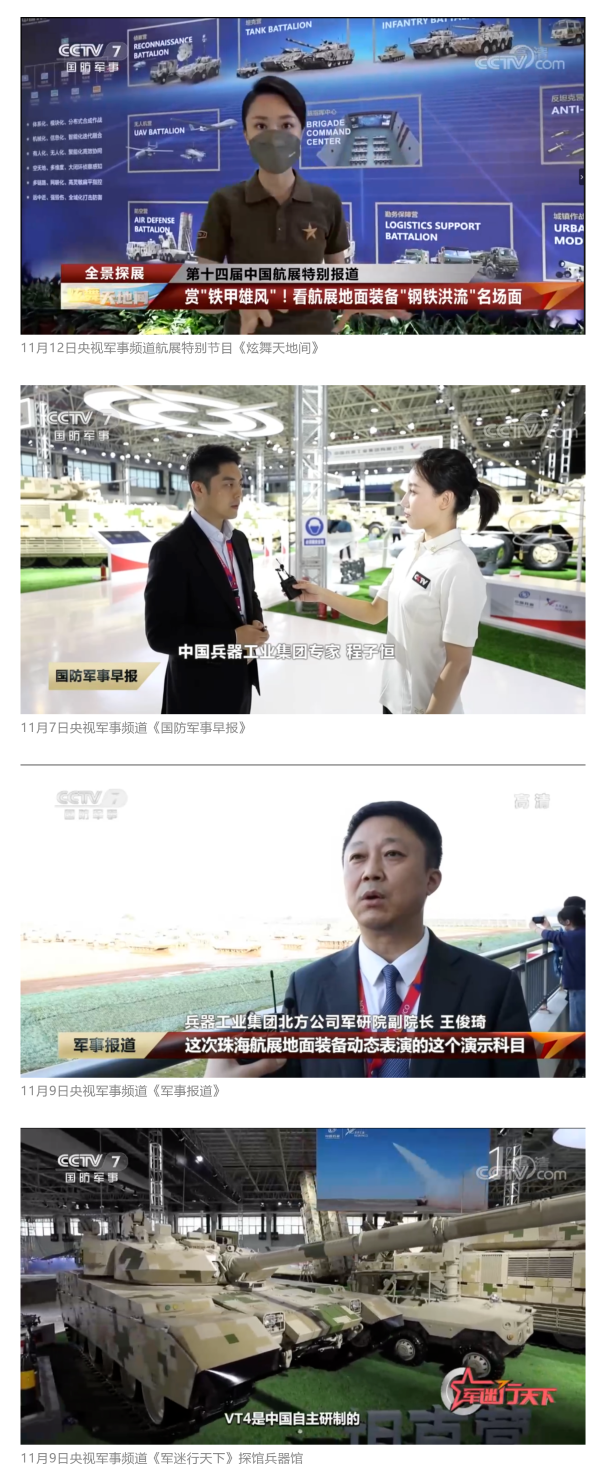 11月6日、7日、9日,央視《新聞聯(lián)播》三次報(bào)道兵器工業(yè)集團(tuán)參展情況,重點(diǎn)介紹了集團(tuán)公司總體參展情況、地面裝備動(dòng)態(tài)演示全新編排、國產(chǎn)輪式反伏擊車首次采用有人駕駛和無人駕駛混合編隊(duì)等內(nèi)容。11月8日,央視新聞?lì)l道直播地面裝備動(dòng)態(tài)演示;11月12日,央視新聞?lì)l道航展特別報(bào)道《藍(lán)天盛會》探訪兵器館,采訪兵器工業(yè)集團(tuán)嘉賓對陸軍合成旅作了報(bào)道。
