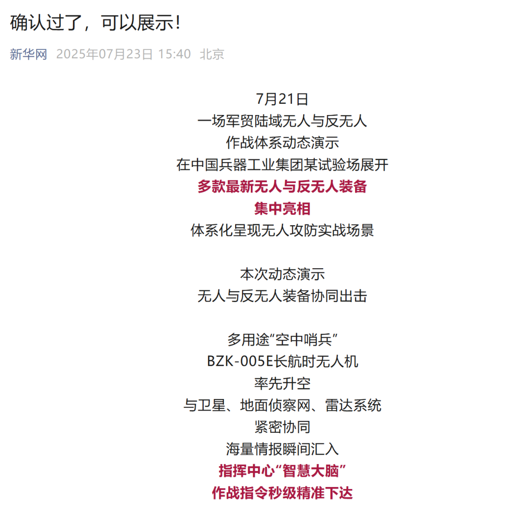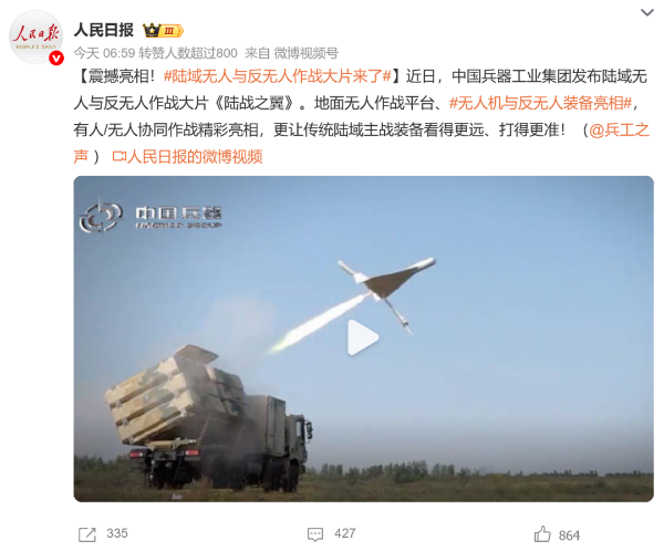 7月21日,中國兵器工業(yè)集團有限公司在位于內(nèi)蒙古的某試驗場舉辦軍貿(mào)陸域無人與反無人作戰(zhàn)體系主題日活動,攜無人機、巡飛彈、反無人機等最新武器裝備登場亮相,展現(xiàn)了一場無人與反無人領(lǐng)域激烈對抗的實戰(zhàn)場景。中央主流媒體、地方媒體、知名網(wǎng)絡(luò)媒體,以及集團公司各宣傳平臺紛紛進(jìn)行報道,多次登上熱搜,引發(fā)廣泛關(guān)注。 央視新聞頻道《新聞直播間》《東方時空》《24小時》、國防軍事頻道《正午國防軍事》《軍事報道》《國防軍事早報》、中文國際頻道《今日環(huán)球》、央視軍事新媒體等報道了集團公司軍貿(mào)陸域無人與反無人作戰(zhàn)體系首次公開實裝動態(tài)演示有關(guān)情況,重點介紹了無人與反無人作戰(zhàn)最新裝備。 央視新聞頻道《新聞直播間》:內(nèi)蒙古 軍貿(mào)陸域無人與反無人作戰(zhàn)最新裝備亮相 央視新聞頻道《新聞直播間》:內(nèi)蒙古 軍貿(mào)陸域無人與反無人作戰(zhàn)最新裝備亮相 記者探訪無人裝備展區(qū) 央視新聞頻道《新聞直播間》:軍貿(mào)陸域無人與反無人作戰(zhàn)最新裝備亮相·記者探訪 最強“盾牌” 反無人機系統(tǒng)新升級 人民日報微博、央視軍事微博、央視新聞客戶端、中國新聞網(wǎng)、中新社國是直通車抖音、環(huán)球網(wǎng)微博、環(huán)球時報(X平臺、英文版客戶端)、中國日報網(wǎng)、央視軍事報道微博、中國軍號微博、中央廣播電視總臺“空天逐夢”微信視頻號、共青團中央B站、國資小新微博等中央主流媒體、國家部委的新媒體播發(fā)集團公司陸域無人與反無人作戰(zhàn)大片等視頻作品。 人民日報微博 央視軍事微博 人民日報、新華網(wǎng)、央視軍事、央視新聞、中央廣播電視總臺中國之聲、中國新聞網(wǎng)、中國日報網(wǎng)、中國日報英文報刊《CHINA DAILY》、《科技日報》、光明日報客戶端、環(huán)球網(wǎng)、環(huán)球時報、人民日報海外版-海外網(wǎng)、央視網(wǎng)、小央視頻、參考消息、瞭望東方周刊、共青團中央、國資小新新媒體、新浪網(wǎng)、騰訊網(wǎng)、搜狐網(wǎng)、鳳凰網(wǎng)、網(wǎng)易網(wǎng)等中央主流媒體、國家部委的新媒體及知名網(wǎng)絡(luò)媒體對集團公司軍貿(mào)陸域無人與反無人作戰(zhàn)體系主題日活動進(jìn)行了圖文、音頻、視頻報道。 央視軍事微信 人民日報微信 新華網(wǎng)微信 來源/各主流媒體 |
