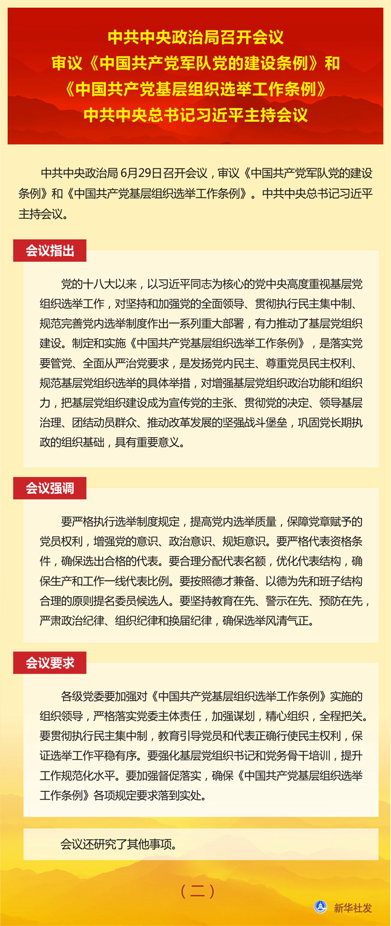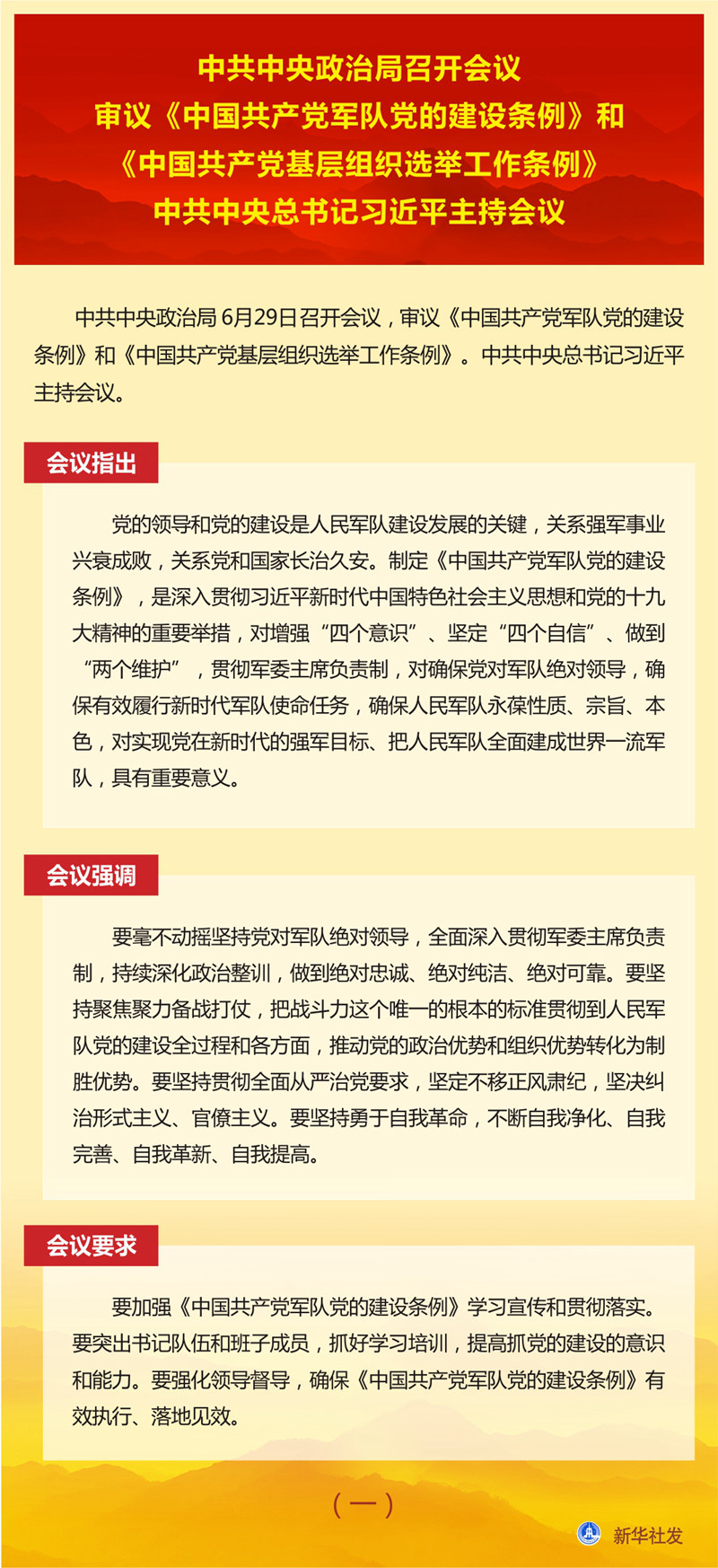 中共中央政治局召開(kāi)會(huì)議 審議《中國(guó)共產(chǎn)黨軍隊(duì)黨的建設(shè)條例》和《中國(guó)共產(chǎn)黨基層組織選舉工作條例》 中共中央總書(shū)記習(xí)近平主持會(huì)議 新華社北京6月29日電 中共中央政治局6月29日召開(kāi)會(huì)議,審議《中國(guó)共產(chǎn)黨軍隊(duì)黨的建設(shè)條例》和《中國(guó)共產(chǎn)黨基層組織選舉工作條例》。中共中央總書(shū)記習(xí)近平主持會(huì)議。 會(huì)議指出,黨的領(lǐng)導(dǎo)和黨的建設(shè)是人民軍隊(duì)建設(shè)發(fā)展的關(guān)鍵,關(guān)系強(qiáng)軍事業(yè)興衰成敗,關(guān)系黨和國(guó)家長(zhǎng)治久安。制定《中國(guó)共產(chǎn)黨軍隊(duì)黨的建設(shè)條例》,是深入貫徹習(xí)近平新時(shí)代中國(guó)特色社會(huì)主義思想和黨的十九大精神的重要舉措,對(duì)增強(qiáng)“四個(gè)意識(shí)”、堅(jiān)定“四個(gè)自信”、做到“兩個(gè)維護(hù)”,貫徹軍委主席負(fù)責(zé)制,對(duì)確保黨對(duì)軍隊(duì)絕對(duì)領(lǐng)導(dǎo),確保有效履行新時(shí)代軍隊(duì)使命任務(wù),確保人民軍隊(duì)永葆性質(zhì)、宗旨、本色,對(duì)實(shí)現(xiàn)黨在新時(shí)代的強(qiáng)軍目標(biāo)、把人民軍隊(duì)全面建成世界一流軍隊(duì),具有重要意義。 會(huì)議強(qiáng)調(diào),要毫不動(dòng)搖堅(jiān)持黨對(duì)軍隊(duì)絕對(duì)領(lǐng)導(dǎo),全面深入貫徹軍委主席負(fù)責(zé)制,持續(xù)深化政治整訓(xùn),做到絕對(duì)忠誠(chéng)、絕對(duì)純潔、絕對(duì)可靠。要堅(jiān)持聚焦聚力備戰(zhàn)打仗,把戰(zhàn)斗力這個(gè)唯一的根本的標(biāo)準(zhǔn)貫徹到人民軍隊(duì)黨的建設(shè)全過(guò)程和各方面,推動(dòng)黨的政治優(yōu)勢(shì)和組織優(yōu)勢(shì)轉(zhuǎn)化為制勝優(yōu)勢(shì)。要堅(jiān)持貫徹全面從嚴(yán)治黨要求,堅(jiān)定不移正風(fēng)肅紀(jì),堅(jiān)決糾治形式主義、官僚主義。要堅(jiān)持勇于自我革命,不斷自我凈化、自我完善、自我革新、自我提高。 會(huì)議要求,要加強(qiáng)《中國(guó)共產(chǎn)黨軍隊(duì)黨的建設(shè)條例》學(xué)習(xí)宣傳和貫徹落實(shí)。要突出書(shū)記隊(duì)伍和班子成員,抓好學(xué)習(xí)培訓(xùn),提高抓黨的建設(shè)的意識(shí)和能力。要強(qiáng)化領(lǐng)導(dǎo)督導(dǎo),確?!吨袊?guó)共產(chǎn)黨軍隊(duì)黨的建設(shè)條例》有效執(zhí)行、落地見(jiàn)效。 會(huì)議指出,黨的十八大以來(lái),以習(xí)近平同志為核心的黨中央高度重視基層黨組織選舉工作,對(duì)堅(jiān)持和加強(qiáng)黨的全面領(lǐng)導(dǎo)、貫徹執(zhí)行民主集中制、規(guī)范完善黨內(nèi)選舉制度作出一系列重大部署,有力推動(dòng)了基層黨組織建設(shè)。制定和實(shí)施《中國(guó)共產(chǎn)黨基層組織選舉工作條例》,是落實(shí)黨要管黨、全面從嚴(yán)治黨要求,是發(fā)揚(yáng)黨內(nèi)民主、尊重黨員民主權(quán)利、規(guī)范基層黨組織選舉的具體舉措,對(duì)增強(qiáng)基層黨組織政治功能和組織力,把基層黨組織建設(shè)成為宣傳黨的主張、貫徹黨的決定、領(lǐng)導(dǎo)基層治理、團(tuán)結(jié)動(dòng)員群眾、推動(dòng)改革發(fā)展的堅(jiān)強(qiáng)戰(zhàn)斗堡壘,鞏固黨長(zhǎng)期執(zhí)政的組織基礎(chǔ),具有重要意義。 會(huì)議強(qiáng)調(diào),要嚴(yán)格執(zhí)行選舉制度規(guī)定,提高黨內(nèi)選舉質(zhì)量,保障黨章賦予的黨員權(quán)利,增強(qiáng)黨的意識(shí)、政治意識(shí)、規(guī)矩意識(shí)。要嚴(yán)格代表資格條件,確保選出合格的代表。要合理分配代表名額,優(yōu)化代表結(jié)構(gòu),確保生產(chǎn)和工作一線(xiàn)代表比例。要按照德才兼?zhèn)?、以德為先和班子結(jié)構(gòu)合理的原則提名委員候選人。要堅(jiān)持教育在先、警示在先、預(yù)防在先,嚴(yán)肅政治紀(jì)律、組織紀(jì)律和換屆紀(jì)律,確保選舉風(fēng)清氣正。 會(huì)議要求,各級(jí)黨委要加強(qiáng)對(duì)《中國(guó)共產(chǎn)黨基層組織選舉工作條例》實(shí)施的組織領(lǐng)導(dǎo),嚴(yán)格落實(shí)黨委主體責(zé)任,加強(qiáng)謀劃,精心組織,全程把關(guān)。要貫徹執(zhí)行民主集中制,教育引導(dǎo)黨員和代表正確行使民主權(quán)利,保證選舉工作平穩(wěn)有序。要強(qiáng)化基層黨組織書(shū)記和黨務(wù)骨干培訓(xùn),提升工作規(guī)范化水平。要加強(qiáng)督促落實(shí),確?!吨袊?guó)共產(chǎn)黨基層組織選舉工作條例》各項(xiàng)規(guī)定要求落到實(shí)處。 會(huì)議還研究了其他事項(xiàng)。 |
