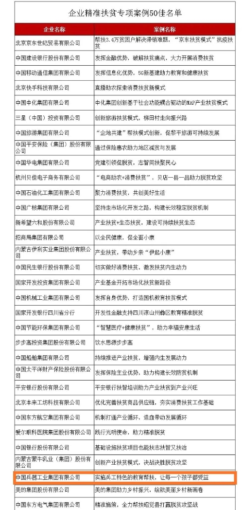 近日,國務(wù)院扶貧辦發(fā)布2020年企業(yè)精準(zhǔn)扶貧案例獲獎(jiǎng)名單,中國兵器工業(yè)集團(tuán)有限公司《實(shí)施兵工特色的教育幫扶,讓每一個(gè)孩子都受益》案例入選2020年企業(yè)精準(zhǔn)扶貧專項(xiàng)案例“50佳”。