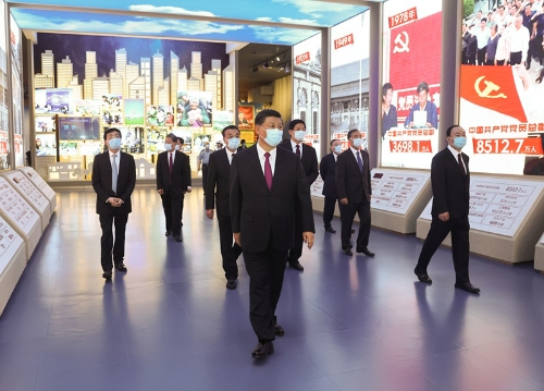 新近落成的中國共產(chǎn)黨歷史展覽館巍然矗立,氣勢恢宏。下午3時(shí)20分許,習(xí)近平等黨和國家領(lǐng)導(dǎo)同志來到這里,步入展廳參觀展覽。展覽以“不忘初心、牢記使命”為主題,精心設(shè)計(jì)了“建立中國共產(chǎn)黨 奪取新民主主義革命偉大勝利”、“成立中華人民共和國 進(jìn)行社會(huì)主義革命和建設(shè)”、“實(shí)行改革開放 開創(chuàng)和發(fā)展中國特色社會(huì)主義”、“推進(jìn)中國特色社會(huì)主義進(jìn)入新時(shí)代 全面建成小康社會(huì) 開啟全面建設(shè)社會(huì)主義現(xiàn)代化國家新(人民日?qǐng)?bào))征程”4個(gè)部分,通過2600余幅圖片、3500多件套文物實(shí)物,第一次全方位、全過程、全景式、史詩般展現(xiàn)中國共產(chǎn)黨波瀾壯闊的百年歷程,濃墨重彩地反映黨的不懈奮斗史、不怕犧牲史、理論探索史、為民造福史、自身建設(shè)史,使人們深刻認(rèn)識(shí)到紅色政權(quán)來之不易、新中國來之不易、中國特色社會(huì)主義來之不易,深刻認(rèn)識(shí)到中國共產(chǎn)黨為什么能、馬克思主義為什么行、中國特色社會(huì)主義為什么好。