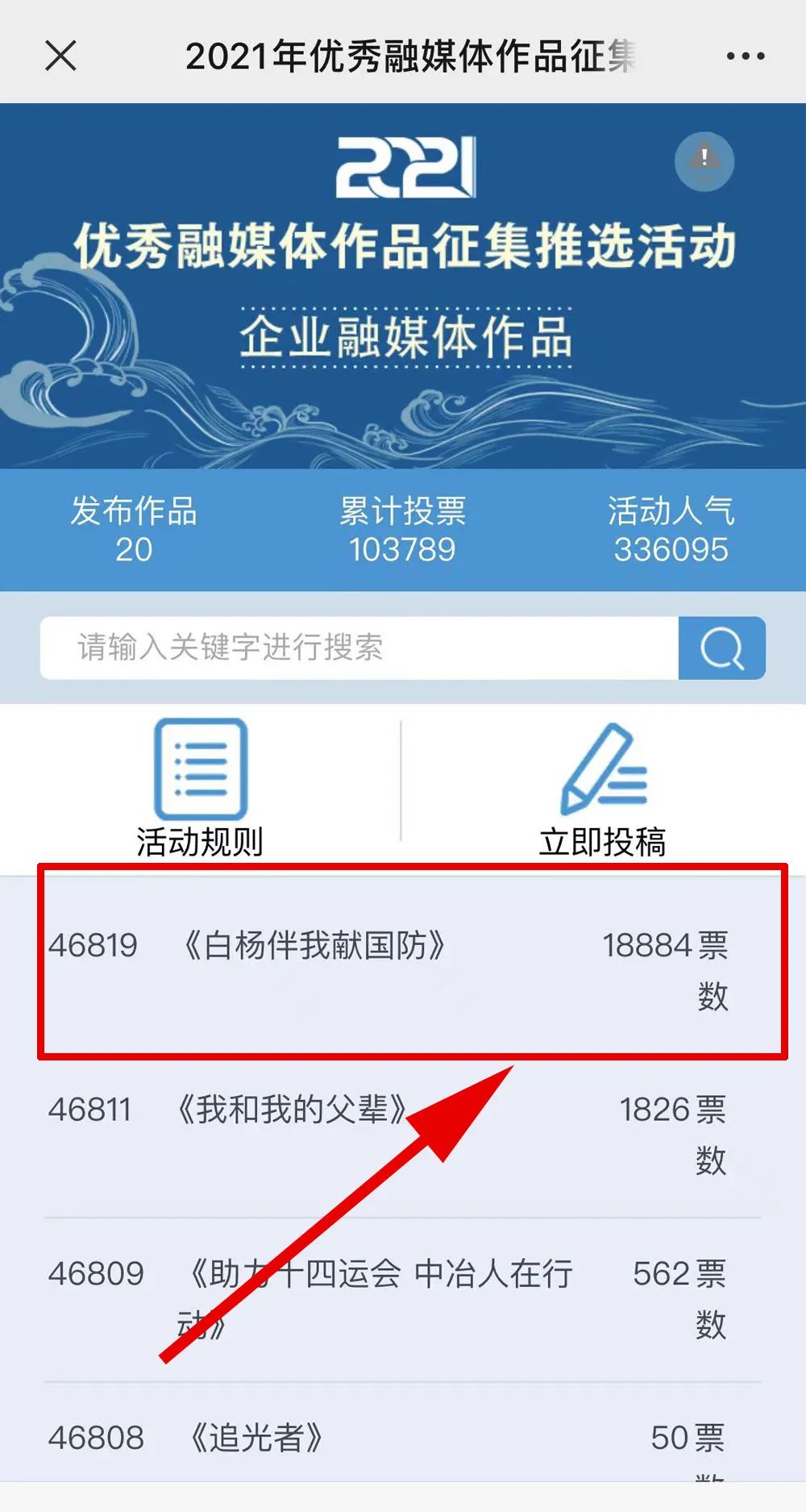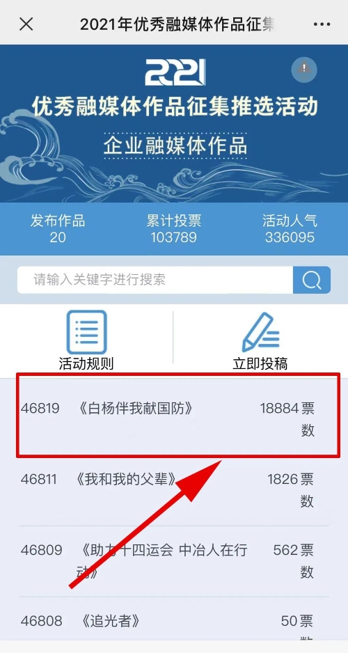 近日,由“文化強(qiáng)國(guó)”光明日?qǐng)?bào)協(xié)同推廣平臺(tái)、光明網(wǎng)、北京師范大學(xué)新媒體傳播研究中心和光明天翼5G融媒實(shí)驗(yàn)室共同主辦的“2021年優(yōu)秀融媒體作品征集推選活動(dòng)”開啟線上投票環(huán)節(jié),經(jīng)過專家委員會(huì)評(píng)審,中國(guó)兵器工業(yè)集團(tuán)北重集團(tuán)《白楊伴我獻(xiàn)國(guó)防》音樂MV入選活動(dòng)前二十名,并進(jìn)入網(wǎng)絡(luò)投票環(huán)節(jié)。 《白楊伴我獻(xiàn)國(guó)防》 楊樹參天 高聳云端的是兵工人 “履行好強(qiáng)軍首責(zé)”的壯志凌云! 深植北疆 傾獻(xiàn)沃土的是北重人 “推動(dòng)高質(zhì)量發(fā)展”的壯志豪情! 白楊樹伴著我們茁壯成長(zhǎng) 見證著我們獻(xiàn)身國(guó)防! 投票方式 1.掃描下方二維碼,進(jìn)入初始界面,點(diǎn)擊“企業(yè)融媒體作品征集”,進(jìn)入投票界面點(diǎn)擊《白楊伴我獻(xiàn)國(guó)防》,點(diǎn)擊“投TA一票”; 2. 每人每日可投10票,直至提示投票達(dá)到上限即可; 3.投票時(shí)間:2022年3月17日09:00-2022年4月2日17:00。 來源/光明網(wǎng)、北重集團(tuán) |