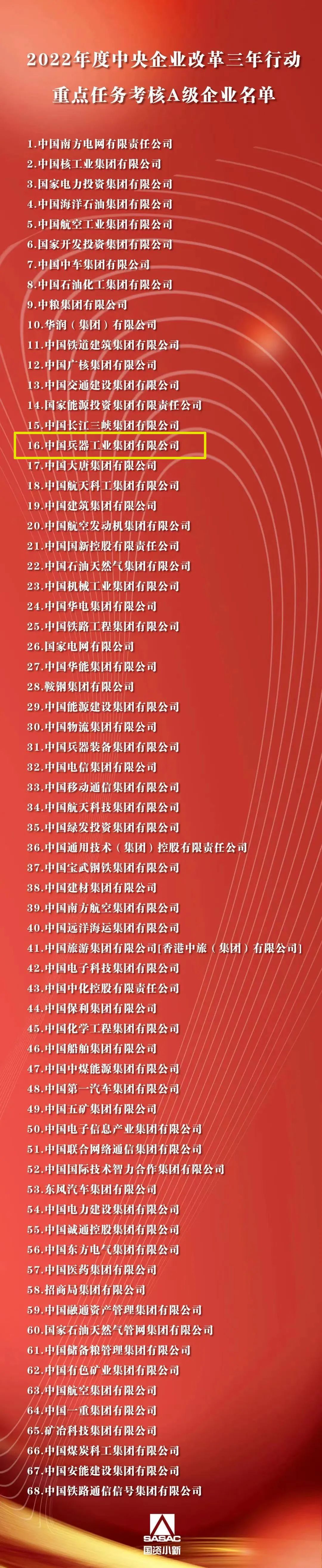 根據(jù)《中央企業(yè)改革三年行動重點任務(wù)考核實施方案(試行)》和《中央企業(yè)改革三年行動重點任務(wù)考核指標(biāo)表(2022版)》,經(jīng)審定,國務(wù)院國資委發(fā)布2022年度中央企業(yè)改革三年行動重點任務(wù)考核A級企業(yè)名單,中國兵器工業(yè)集團有限公司獲評A級。 來源/國資委網(wǎng)站 |