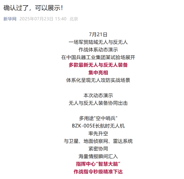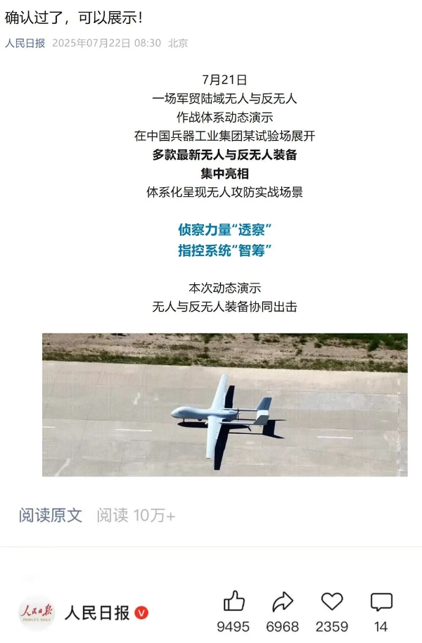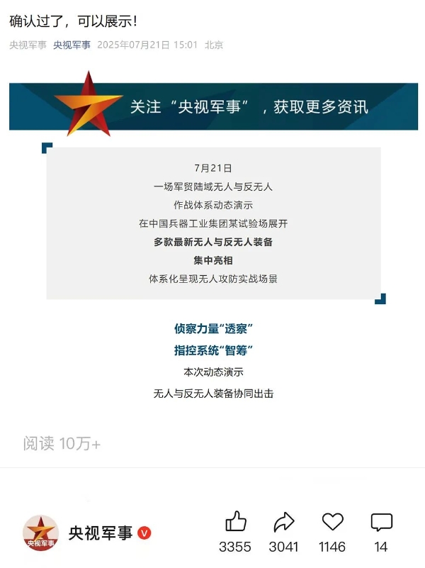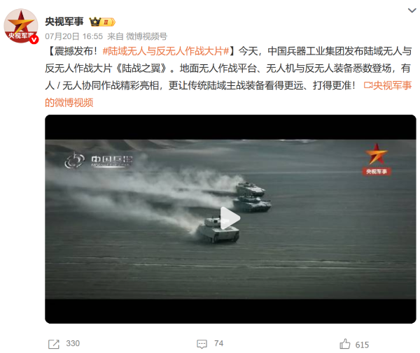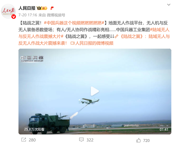 7月21日,中國兵器工業(yè)集團有限公司在位于內(nèi)蒙古的某試驗場舉辦軍貿(mào)陸域無人與反無人作戰(zhàn)體系主題日活動,攜無人機、巡飛彈、反無人機等最新武器裝備登場亮相,展現(xiàn)了一場無人與反無人領(lǐng)域激烈對抗的實戰(zhàn)場景。中央主流媒體、地方媒體、知名網(wǎng)絡(luò)媒體,以及集團公司各宣傳平臺紛紛進(jìn)行報道,多次登上熱搜,引發(fā)廣泛關(guān)注。 央視新聞頻道《新聞直播間》《東方時空》《24小時》、國防軍事頻道《正午國防軍事》《軍事報道》《國防軍事早報》、中文國際頻道《今日環(huán)球》、央視軍事新媒體等報道了集團公司軍貿(mào)陸域無人與反無人作戰(zhàn)體系首次公開實裝動態(tài)演示有關(guān)情況,重點介紹了無人與反無人作戰(zhàn)最新裝備。 央視新聞頻道《新聞直播間》:內(nèi)蒙古 軍貿(mào)陸域無人與反無人作戰(zhàn)最新裝備亮相 央視新聞頻道《新聞直播間》:內(nèi)蒙古 軍貿(mào)陸域無人與反無人作戰(zhàn)最新裝備亮相 記者探訪無人裝備展區(qū) 央視新聞頻道《新聞直播間》:軍貿(mào)陸域無人與反無人作戰(zhàn)最新裝備亮相·記者探訪 最強“盾牌” 反無人機系統(tǒng)新升級 人民日報微博、央視軍事微博、央視新聞客戶端、中國新聞網(wǎng)、中新社國是直通車抖音、環(huán)球網(wǎng)微博、環(huán)球時報(X平臺、英文版客戶端)、中國日報網(wǎng)、央視軍事報道微博、中國軍號微博、中央廣播電視總臺“空天逐夢”微信視頻號、共青團中央B站、國資小新微博等中央主流媒體、國家部委的新媒體播發(fā)集團公司陸域無人與反無人作戰(zhàn)大片等視頻作品。 人民日報微博 央視軍事微博 人民日報、新華網(wǎng)、央視軍事、央視新聞、中央廣播電視總臺中國之聲、中國新聞網(wǎng)、中國日報網(wǎng)、中國日報英文報刊《CHINA DAILY》、《科技日報》、光明日報客戶端、環(huán)球網(wǎng)、環(huán)球時報、人民日報海外版-海外網(wǎng)、央視網(wǎng)、小央視頻、參考消息、瞭望東方周刊、共青團中央、國資小新新媒體、新浪網(wǎng)、騰訊網(wǎng)、搜狐網(wǎng)、鳳凰網(wǎng)、網(wǎng)易網(wǎng)等中央主流媒體、國家部委的新媒體及知名網(wǎng)絡(luò)媒體對集團公司軍貿(mào)陸域無人與反無人作戰(zhàn)體系主題日活動進(jìn)行了圖文、音頻、視頻報道。 央視軍事微信 人民日報微信 新華網(wǎng)微信 來源/各主流媒體 |